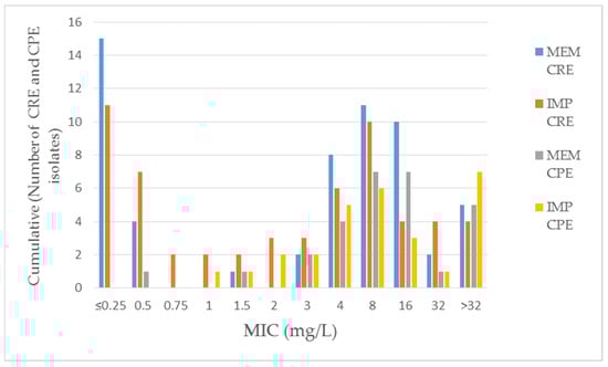 Based on the determined MIC values for imipenem and meropenem of the studied K. pneumoniae isolates, a higher level of resistance was found in the CPE isolate group compared to the CRE isolates (Figure 3; Figures S2 and S3).