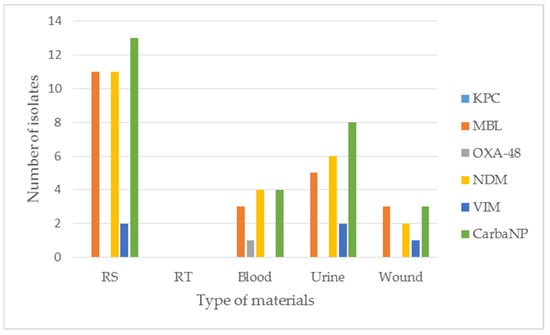 The carbapenemase KPC (class A) and the metal-β-lactamases VIM, NDM (MBL, class B) and OXA-48 (class D) are the most common in Enterobacteriaceae [,]. The occurrence of resistance to carbapenems may also be associated with the presence of efflux pumps and variable expression of porin proteins [,].