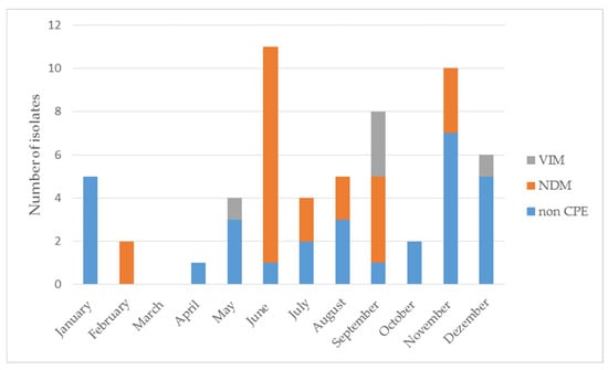 In June 2020, a significant increase in the number of CPE isolates was recorded compared to the remaining months of the year. The tested CPE isolates belonged to the species K. pneumoniae, and all of them produced NDM-type carbapenemase (Figure 5).