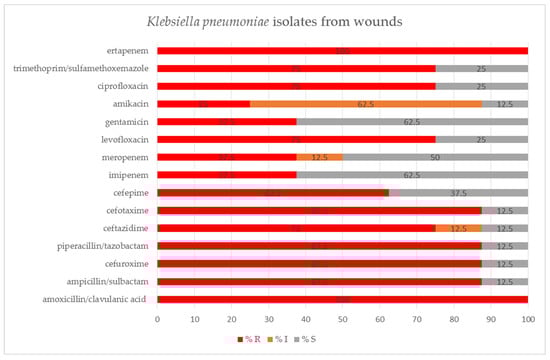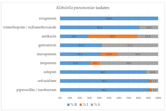 Percentage of tested Klebsiella pneumoniae isolates from wounds susceptible and resistant to the selected antibiotics, determined by VITEK-2 automated system; S—susceptible; I—susceptible, increased exposure; R—resistant.