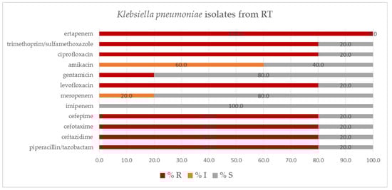 From K. pneumoniae strains isolated from RT, all proved to be resistant to ertapenem, and a proportion of the isolates showed reduced sensitivity to meropenem (20.0%) and amikacin (60.0%). All strains were sensitive to imipenem, and more than 80% of the strains were sensitive to meropenem and gentamicin (Figure 7).