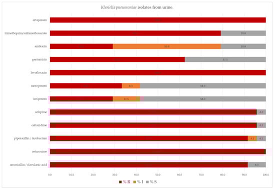 Percentage of tested Klebsiella pneumoniae isolates from urine susceptible and resistant to the selected antibiotics, determined by VITEK-2 automated system; S—susceptible; I—susceptible, increased exposure; R—resistant.