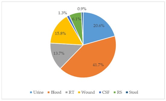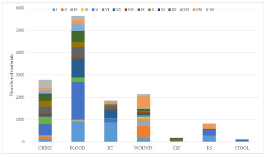 The clinical materials tested were described as: blood (n = 5644), urine (n = 2782), wound secretions (n = 2133), RT—respiratory secretions (n = 1852), rectal swabs on CPE carriers (n = 820), CSF—cerebrospinal fluid (n = 174) and stool (n = 123). Figure 11 presents the proportions of the analysed clinical materials.