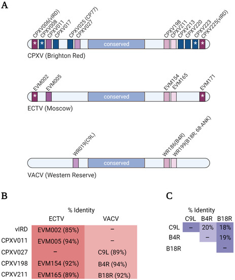 - Bratke, K.A.; McLysaght, A.; Rothenburg, S. A survey of host range genes in poxvirus genomes. Infect. Genet. Evol. 2012, 14, 406–425. [Google Scholar] [CrossRef] [PubMed]
