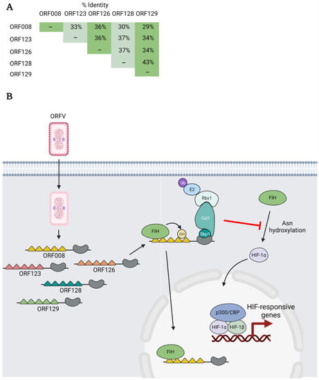 | ORFs 008, 123, 126, 128, and 129 | ORFV | FIH | No | Promote expression of HIF-responsive genes to support viral replication? |