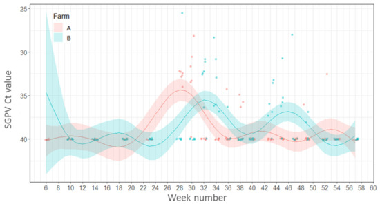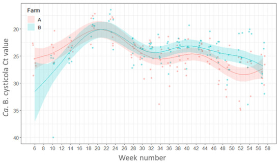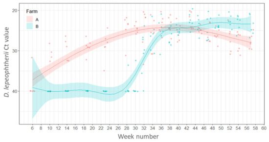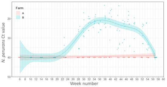 The lowest Ct value means corresponding to the largest parasite load, were found between weeks 28–43 (10 August 2016–22 November 2016) on Farm A and then the parasite load decreased after week 45 (7 December 2016) (Figure 1). On Farm B, the highest parasite load means were detected between weeks 43–54 (23 November 2016–9 February 2017). Contrary to Farm A, the levels of the parasite on Farm B remained high up to the final sampling time point in week 57 (1 March 2017) (Figure 1).