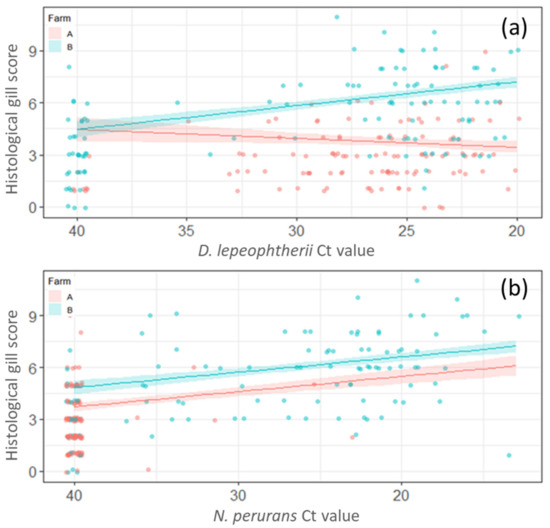 For linear model 2 (LM2) (Ct values were used instead of presence/absence of pathogens) the Farm ID was significantly associated with HGS and Farm B had a significantly greater score compared to Farm A (p < 0.05). Season was significantly associated with HGS, and model estimates suggested that the score was significantly lower (p < 0.05) in spring, winter-1 and winter-2 compared to autumn. There were no statistically significant differences between summer and autumn (p ≥ 0.05). An increase in D. lepeophtherii load (lower Ct values) was associated with an increase in the HGS on Farm B only (p < 0.05) (Figure 5a). Higher loads of N. perurans correlated with an increase in HGS in both farms (Figure 5b).
