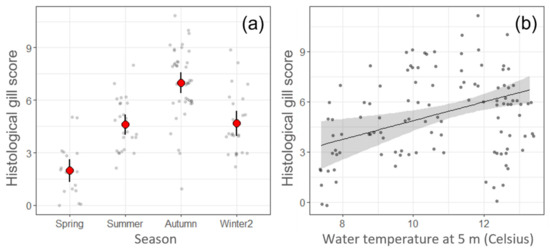 Representation of linear regression models with the histological gill score (HGS) on Farm B. (a) Linear model 3 (LM3) and linear model 4 (LM4), note the strong association between season and HGS, the points show raw data; small grey points show the raw HGS data, while large red points with error bars show predictions from models and 95% CI. (b) Linear model 5, when temperature was used instead of season, the increase of temperature was significantly (p < 0.05) associated with increased HGSs. Line and shaded area show predicted HGS and 95% CI.