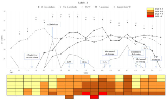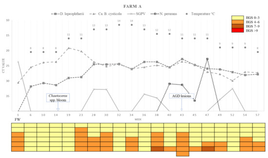 A summary of the loads (Ct values) of the four different chosen pathogens detected in the farms across the sampling points, water temperature, and the HGSs for each of the fish analysed is presented in Figure 7 (Farm A) and Figure 8 (Farm B).