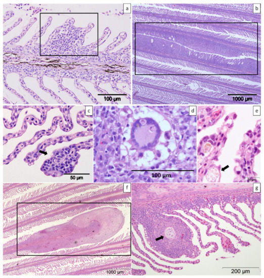 - Noguera, P.; Olsen, A.B.; Hoare, J.; Lie, K.I.; Marcos-López, M.; Poppe, T.T.; Rodger, H. Complex gill disorder (CGD): A histopathology workshop report. Bull. Eur. Assoc. Fish Pathol. 2019, 39, 172–176. [Google Scholar]