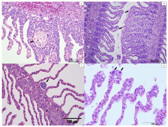 Histologic sections of gills from farmed Atlantic salmon stained with haematoxylin and eosin. (a) Unidentified metazoan between two lamellae with epithelial hyperplasia (arrow). (b) Amoebic gill disease lesion with presence of amoebae (arrows). (c) Epitheliocyst in the base of the lamellae suggestive of Candidatus Clavochlamydia salmonicola (arrow). (d) Epitheliocysts in the distal part of the lamellae suggestive of Candidatus Branchiomonas cysticola (arrows).