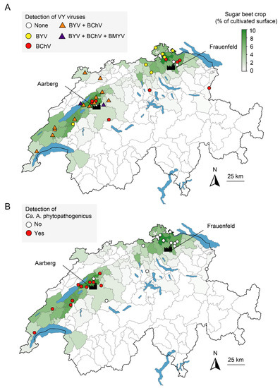 Detection of the causal agents of VY (A) and SBR (B) in Switzerland in 2020. Points indicate the location of sampling and are colored according to the detected pathogen. For VY, triangles indicate the presence of multiple viruses. Data for relative density of sugar beet crops (in green) were reproduced from the Office Fédéral de la Statistique with permission. The location of the factories of Aarberg and Frauenfeld is indicated.