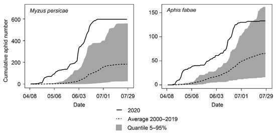 Since 1983, winged aphids have been monitored at the Agroscope suction trap (Changins, Switzerland) every day from April to July. Specimens of M. persicae and A. fabae are scored individually based on morphological identification. Data for 2020 were compared with data collected from 2000–2019. Plots were generated on R.