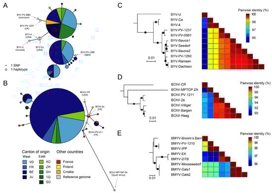 Haplotype data for BYV and BChV, the viruses representing the majority of VY cases in Switzerland, highlighted low variability and close proximity to sequences obtained from Europe in recent years (Figure 5A,B). These results were further supported by phylogenies of complete genomes (Figure 5C,D). Likewise, analyses of the three BMYV genomes indicated high conservation (Figure 5E). It is expected that additional sequences from other countries will help to better characterize the population dynamics of these VY viruses.