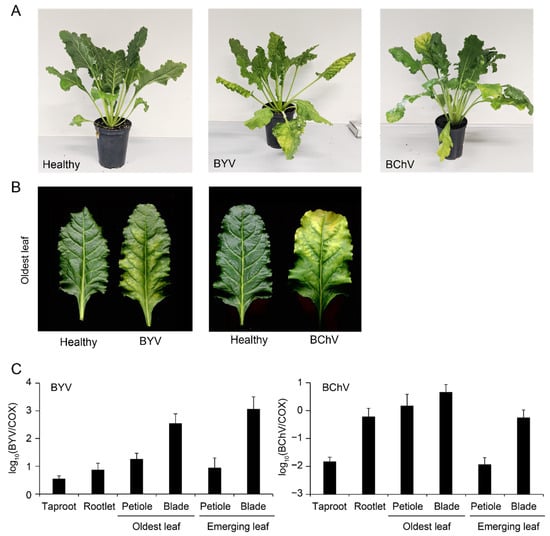 First symptoms were observed at 15 and 30 dpi for BYV and BChV, respectively, consistent with previous works [37]. Interveinal yellowing at early stages followed by chlorosis and small necrotic patches were visible on BYV-inoculated plants (Figure 6A-center,B-left). The symptoms developed on BChV-inoculated plants consisted of chlorotic patches at the tip of older leaves (Figure 6A,B-right). At 60 dpi, all plants exhibited leaf symptoms but no root symptom was noted.
