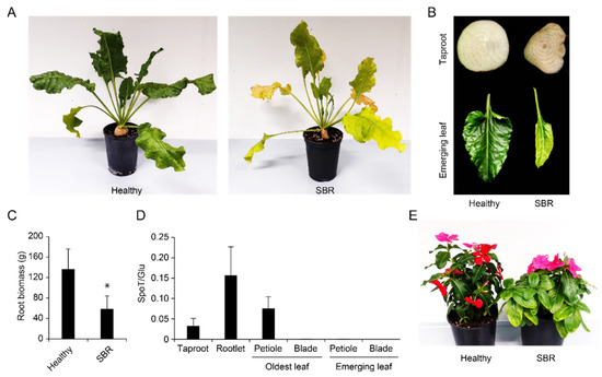 SBR infection in greenhouse conditions. (A) Sugar beet non-inoculated (left) or exhibiting SBR symptoms (right) at 90 dpi; (B) taproot cross section (top) and emerging leaf (bottom) from a healthy control (left) or a SBR-infected plant (right); (C) fresh root biomass for healthy controls (n = 10) or SBR-infected plants (n = 4); (D) quantification of Ca. A. phytopathogenicus DNA (SpoT) relative to plant DNA (Glu) in different tissues (n = 4); (E) yellowing on a grafted SBR-infected periwinkle (right) in comparison with a healthy control (left). Error bars correspond to standard deviations. “*” indicates p < 0.05 (Welch’s t-test).
