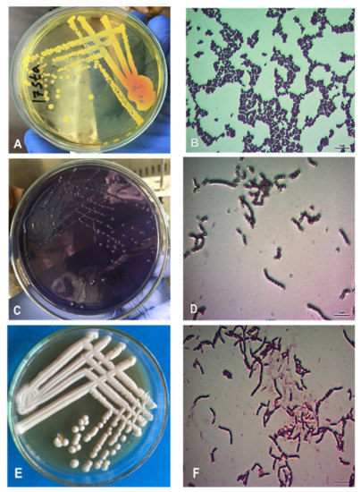 Bacteria were isolated and morphologically identified as specific colony features were observed in the selective agar media and Gram staining characteristics (Figure 1).