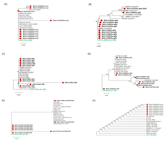 Maximum likelihood evolutionary tree based on nucleotide sequence of different target genes. (A) nuc gene of S. aureus (266 bp). (B) gtfK gene of S. sobrinus (516 bp). (C) lf gene of L. fermentum (317 bp) (D). Virulence clfA gene of S. aureus (943 bp). (E) β-lactamase resistance gene blaTEM of Streptococcus and Lacotobacillus (861 bp). (F) Methicillin-resistance gene mecA of S. aureus (608 bp). Bootstrap values (1000 replication) were shown next to the nodes. All ambiguous positions were removed for each sequence pair (pairwise deletion option). Red circles indicated Bangladeshi isolates. The tree is rooted to the green color taxon from a different country.