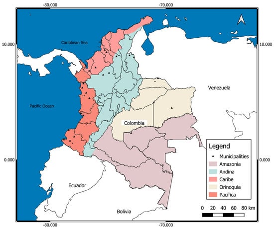 Political map of Colombia with its five natural regions. Pink: Atlantic/Caribbean Coast (Atlántica/Caribe) (132,288 km2; 10,301,982 inhabitants); departments (south to north): Córdoba, Sucre, Bolívar, Atlántico, Magdalena, Cesar, Guajira; Orange: Pacific Coast (Costa Pacífica) (excludes the part of the Andean mountains of the departments; 83,170 km2; 1,500,753 inhabitants); departments (north to south): Chocó, Valle Cauca, Cauca, Nariño; Beige: Orinoquia or Eastern Plains (254,335 km2; 1,840,922 inhabitants); departments (north to south): Arauca, Casanare, Vichada, Meta, Guainía, Guaviare; Violet: Amazonia (483,119 km2; 1,143,631 inhabitants); departments (north to south): Caquetá, Vaupés, Putumayo, Amazonas; Blue: Andean (Andina) (mountainous area, with a height greater than 1600 m above the sea; 282,540 km2 (3,068,593 inhabitants); departments (north to south): Norte de Santander, Santander, Antioquia, Boyacá, Cundinamarca, Caldas, Risaralda, Quindío, Tolima, Huila (includes the part of the Andean mountains of the departments). Source: Own elaboration on a map from the Agustín Codazzi Geographical Institute (IGAC) of Colombia. https://www.colombiaenmapas.gov.co/inicio/, accessed on 25 July 2022.