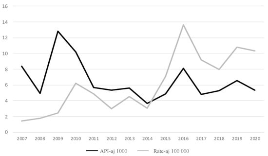 Total malaria and severe malaria cases in Colombia, 2007–2020: annual parasite index (API) of malaria and annual rate of severe malaria. API varies between 3.7 and 12.8 per 1000. Rate varies between 1.4 and 13.6 per 100,000. As of 2014, the rate of SM showed a sharp increase, while the API was relatively stable.