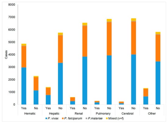 We found that the proportionally most affected O–S in cases caused by both P. vivax and P. falciparum are, in decreasing order, hematic, other, hepatic, renal, and pulmonary, and the only difference is in brain involvement, which is the sixth most commonly affected O–S in P. vivax (1%) and the fifth most common in P. falciparum (3%). These clinical findings are also corroborated by other studies in different countries. In a review by Baird and coworkers in 2013, they refer to studies that show serious pathological clinical states associated with a primary malaria diagnosis due to P. vivax. Studies describe P. vivax’s geographic distribution (India, Indonesia, Brazil, Venezuela, Colombia, Sudan, Pakistan, Afghanistan, Singapore, Uganda, Turkey, Honduras, Iran, Malaysia), showing a wide range of syndromes, with the exception of the low frequency of severe malarial anemia (SMA). Acute respiratory distress syndrome (ARDS), cerebral syndromes (seizures or coma), severe thrombocytopenia, hemorrhage, and shock syndromes are described in many of the patients [15].