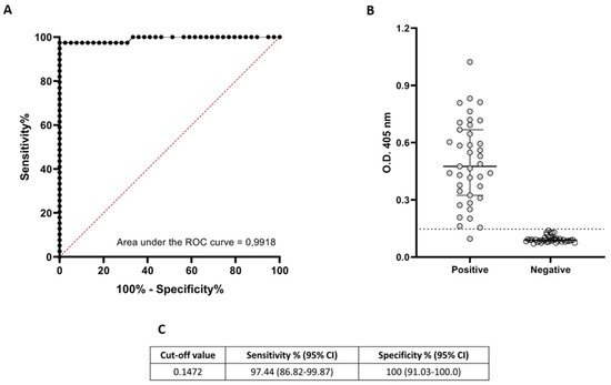 All collected data were summarized using descriptive statistics. Estimated parameters are reported with 95% confidence interval (CI). The statistical significance level was established at 5%. Both statistical methods and plots were used to assess test results. Optical density (O.D.) values of the replicates were evaluated using the coefficient of variation (CV). The ROC curve analysis was performed to determine the optimal cut-off based on the Youden index to establish the best combination of sensitivity and specificity. The agreement between two operators was assessed using the Cohen’s kappa. The analyses were performed with STATA software version 14.0 (College Station, TX: StataCorp LLC) and GraphPad Prism 8.0.2. (GraphPad Software, San Diego, CA, USA).