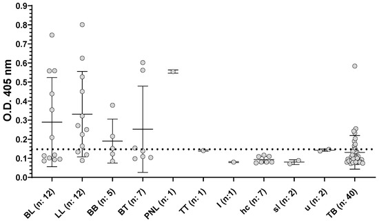 We tested the second set of serum samples, and applied the corresponding cut-off value. As shown in Figure 2, the performance of this ELISA varied among the subpopulation of SLALT classified following Ridley–Jopling scale. In this case the statistically determined cut-off, gave a total of 56.4% of positive among patients confirmed diagnosis of leprosy (BL, LL, BB, BT, PNL, TT and I, see Figure 2 and Supplementary 2), of which 50% of the BL patients and 75% of the LL patients gave positive results (Figure 2, Supplementaries 1 and 2). Dividing the patients accordingly to MB and PB we found that, respectively, 54 % and 50% were positive (Supplementary Materials 1 and 2). Applying this cut-off we also observed a 22.5% of positivity among the TB patients.