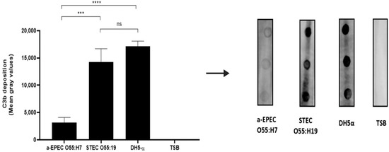 Deposition of C3b on the bacterial surface. C3b binding on the bacterial surface was determined by the dot blot technique. Nitrocellulose membrane coated with capsulated O55:H7 aEPEC, noncapsulated O55:H19 STEC, and noncapsulated DH5-α were incubated with normal human serum as a source of complement. The membrane was then incubated with goat IgG anti-C3b. After incubation, the membrane was washed and incubated with rabbit anti-goat IgG labeled with peroxidase. The deposition of C3b on the bacterial surface was detected by chemiluminescence (SuperSignalDensitometric) analyses, and the intensity of the signal was determined in pixels by Image J software developed at the National Institutes of Health and the laboratory for Optical and Computational Institutes (LOCI, University of Wisconsin, USA) Version 1.5. The results were plotted as “Mean Gray Values” (average of intensity units in selection). Unpaired t-test: ***/**** (p-value ≤ 0.05) was considered statistically significant. n.s. = not significant.