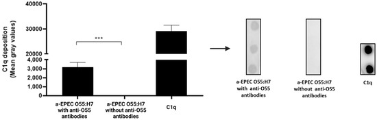 Deposition of C1q on capsulated aEPEC O55:H7 surface. For C1q determination, the nitrocellulose membrane was coated with capsulated EPEC O55:H7 previously incubated for 1 h at 37 °C in the presence or absence of anti-O55 antibodies. As a positive control, the membrane was coated with 125 ng of C1q. Subsequently, the membrane was blocked and incubated for 1 h at room temperature with 6.2 µg of C1q in PBS. The membrane was then washed and incubated with goat IgG anti-C1q. After incubation, the membrane was washed and incubated with rabbit anti-goat IgG labeled with peroxidase. The deposition of C1q on the bacterial surface was detected by chemiluminescence (SuperSignalDensitometric) analyses, and the intensity of the signals was determined in pixels by Image J software. The results were plotted as “Mean Gray Values” (average intensity units in selection). Unpaired t-test: *** (p-value ≤ 0.05) was considered statistically significant.