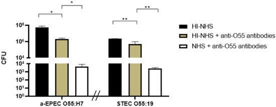 In order to determine the ability of the complement system to lyse the bacterial samples, 5 µL of aEPEC O55:H7 and STEC O55:H7 (1 × 1012 CFU/mL) were added to a 96 well culture plate. The plate was then incubated for 16 h at 37 °C with 50 µL of rabbit anti-O55 serum in the presence of either 15 µL of normal human serum (NHS) or 15 µL of heat-inactivated normal human serum (HI-NHS). NHS was used as a source of complement. Subsequently, the bacterial viability was determined by counting the number of colony-forming units (CFU) according to the methodology described by Baron and coworkers and Beck et al. [38,39].