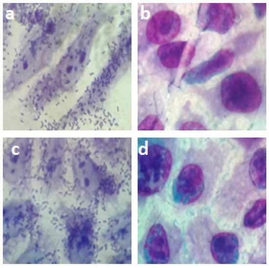 Influence of anti-O55 antibodies on bacterial adhesion. HEp-2 cells were incubated for 2 h with: (a) aEPEC O55:H7 in DMEM; (b) aEPEC O55:H7 in the presence of anti-O55 polysaccharide antibodies; (c) STEC O55:H19 in DMEM; (d) STEC O55:H19 in the presence of anti-O55 polysaccharide antibodies. An ocular 10 objective (×100) was used for visualization.
