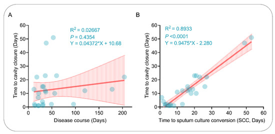 The data were analyzed using GraphPad Prism 9.4.0 software (San Diego, CA, USA). For the enumeration data, a chi-square test or Fisher’s exact test was used according to the number of cases. The RR and OR were determined using the Koopman asymptotic score and Baptista–Pike method, respectively. Correlations between sex, age, disease course, number of EBVs, number of cavities, changes in cavity, cavity closure time, adverse events, time to SCC, linezolid use, and recurrence were assessed using Pearson’s correlation coefficient. The correlation between the cavity closure time and disease course or time to SCC was analyzed using a simple linear regression. p < 0.05 was considered statistically significant.