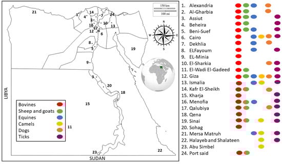 Egypt has a unique location in the northeastern corner of Africa and southwestern area of Asia. Egypt is known for having a hot, dry climate throughout the country, and the summer temperatures are high, particularly in Upper Egypt, creating a suitable environment for various tick species [24,33]. A total of 78 studies from 24 locations all over Egypt (Figure 2) were reviewed, of which several detected TBPs infecting more than one host species. The included studies were categorized based on different hosts into 37 studies on bovines, 15 on sheep and goats, 9 on equines, 12 on dromedary camels, 11 on dogs, and 22 on ticks. In general, Babesia, Theileria, and Anaplasma were the most frequently tested TBPs.