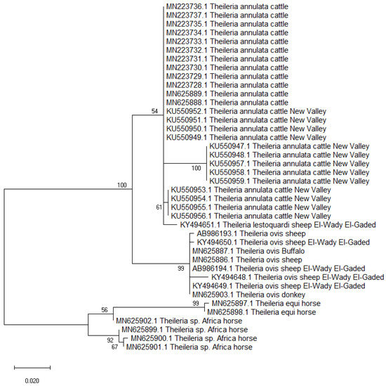A total of 40 partial 18S rRNA nucleotide sections (418 nucleotides) were retrieved during the GenBank search, including 25 isolates of T. annulata from cattle; 8 T. ovis from sheep, buffaloes, and donkeys; 4 Th. sp. Africa from horses; 2 T. equi from horses; and 1 T. lestoquardi from sheep. The phylogenetic analysis suggested the suitability of the 18S rRNA in the Theileria spp. delimitation; however, lower sequence variabilities were detected within isolates of the same species. The Theileria annulata isolates from Egypt were divided into three subclades in a clade that also included T. lestoquardi from sheep, suggesting that both species have a common ancestor [72]. The isolates of T. ovis from sheep, buffaloes, and donkeys were clustered together in a separate clade but in the same branch that included the T. annulata clade. Meanwhile, the isolates of Th. sp. Africa and T. equi from horses were genetically related and arranged in the second branch (Figure 3). The 18S rRNA gene had varying levels of genetic variations among different isolates globally, but Tams-1 gene was previously reported to be highly polymorphic [69,71].