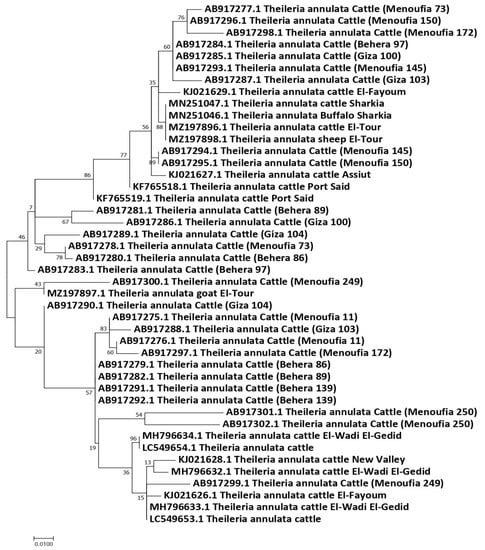 Maximum likelihood tree based on the Tams-1 gene sequences of T. annulata from animals in Egypt. The Hasegawa–Kishino–Yano (HKY) model was used. The node numbers represent values with bootstrap support from 1000 pseudoreplicates.