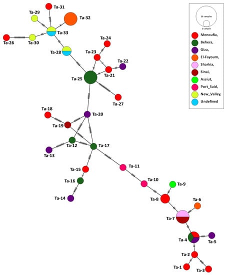 Haplotype network established based upon the Tams-1 nucleotide sections of T. annulata isolates from Egypt. The network describes the distribution of the revealed haplotypes in relation to the governorates of origin, indicated by different colors. The circle sizes are consistent with the haplotype frequency. The number of mutations distinguishing the haplotypes is shown by the hatch marks.