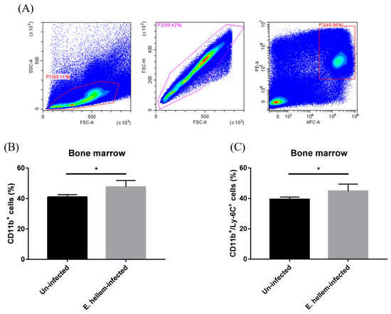 In the peripheral blood, we found the expression level of Ly-6C decreased after E. hellem infection. It could be the result of the decreasing of absolute number of monocytes due to increased extravasation. This inference may be supported by the study that concluded Leishmania major infection leads to the activation of bone marrow HSPCs and enhances myelopoiesis in the bone marrow, with a decreased absolute number of monocytes in the peripheral blood [20,28]. In the acute inflammatory phase of Listeria monocytogenes infection, monocytic left shift occurs in the bone marrow at about 72 h [29]. Such a left shift was also reported in the chronic infection of E. hellem, which needs further exploration.