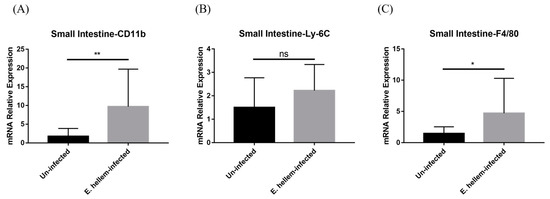 Cell surface markers expressions. The expression levels of CD11b, Ly-6C, F4/80 in small intestine were measured by qPCR in E. hellem-infected group and uninfected group, respectively. (A), the expression level of CD11b showed significant upregulation compared with uninfected group. (B), the expression of Ly-6C ascended without significance between two groups. (C), the expression of F4/80 was upregulated significantly after infection of E. hellem. (* = p < 0.05, ** = p < 0.01, ns = No Significance, n = 6 for E. hellem-infected group, n = 5 for uninfected group).