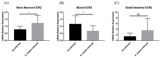 Chemokine receptor expression. The expression level of CCR2 was detected in bone marrow, peripheral blood and small intestine from E. hellem-infected mice and uninfected mice, respectively, by means of qPCR. (A) The expression of CCR2 in bone marrow, upregulated with significance compared to the controls. (B) The expression of CCR2 was significantly downregulated in peripheral blood after infection. (C) CCR2 expression in small intestine was upregulated after E. hellem-infecting. (* = p < 0.05, ns = No Significance, n = 6 for E. hellem-infected group, n = 5 for uninfected group).