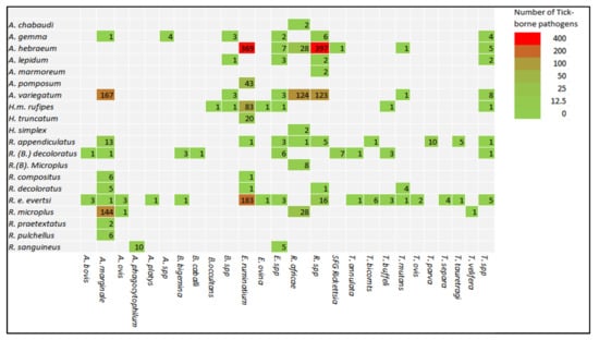 Heat map for linked relationship between ticks and tick-borne pathogens in the Southern African Developing Community region.