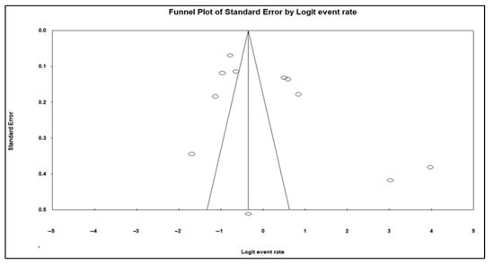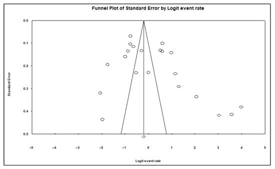 A funnel plot of standard error by logit event rate together with the Begg and Mazumdar rank correlation test were used to assess publication bias. Our data analyses showed no evidence of publication bias for almost all risk factors for animal studies, except for study period 2010–2021 (Table 2, Figure 3) and the country Tanzania, where significant bias was observed in regard to asymmetries of the funnel plots and p-values of 0.040 and 0.020, respectively (Table 2, Figure 4).