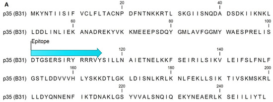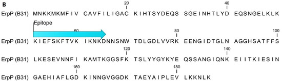 Sequence of p35 (accession WP_010256558.1) (A) and ErpP (accession WP_010883886.1) (B) from the B31 strain of B. burgdorferi demonstrating the location of the epitope identified by epitope mapping.