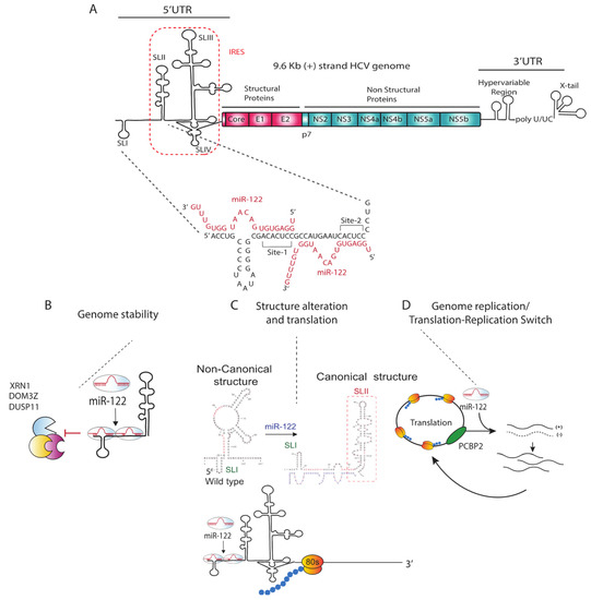 - Kunden, R.D.; Ghezelbash, S.; Khan, J.Q.; Wilson, J.A. Location specific annealing of miR-122 and other small RNAs defines an Hepatitis C Virus 5′ UTR regulatory element with distinct impacts on virus translation and genome stability. Nucleic Acids Res. 2020, 48, 9235–9249. [Google Scholar] [CrossRef] [PubMed]