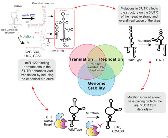 A method by which miR-122 is reported to promote HCV replication is through stabilization of the viral genome (Figure 3). Based on this, Chahal et al. suggested that mutations to the auxiliary region of miR-122 binding site 1 (C2G, C3U, U4C) located near the genomic 5′ terminus protect the genome from degradation, and this notion was supported by in vitro stability assays showing that the mutant RNAs were resistant to degradation by Xrn1 [68]. However, small RNAs that anneal to nucleotides 19–37 and not to the 5′ terminus also stabilized the genome and promoted HCV replication, indicating that miR-122 5′ end annealing is not essential for genome stabilization [44].