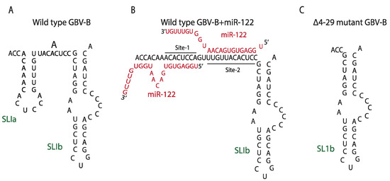 Predicted structures of 5′UTR of HCV and GBV-B with or without miR-122. (A) Wild type GBV-B without miR-122 (1–62 nt), (B) Wild type GBV-B with miR-122 (1–62 nt), (C) ∆4-29 mutant GBV-B without miR-122.