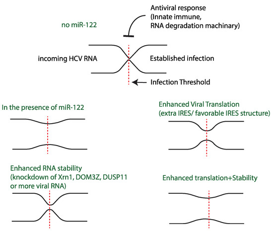 Establishment of a successful viral infection is determined by the outcome of competition between viral translation/replication kinetics and host antiviral response. Host cells defend against viral infection using strategies that include translation inhibition and viral genome degradation to create a barrier to the initiation of an infection. In turn, viruses have evolved many mechanisms to block the activation of the antiviral pathways to maintain virus translation and genome stability [119,120]. However, a recent publication suggests that the dynamics of virus translation and replication can also overcome the antiviral barrier. For example, to establish a picornavirus infection requires that the virus produce sufficient protein to successfully switch from genome translation to genome replication, but in 15–20% of picornavirus infected cells the incoming viral RNA fails to translate sufficiently to initiate the switch, likely due to antiviral conditions in the cell. However, the genomes that fail to switch to replication will try again, reinitiating translation to further attempt to establish an infection [121]. Similarly, we propose that miR-122 allows HCV to overcome a barrier to infection, specifically RNA degradation by host enzymes and poor translation efficiency. In the absence of miR-122, translation efficiency is poor and the genomic RNA is subject to degradation; this barrier blocks the establishment of an infection. In the presence of miR-122, the RNA is stabilized, translation is efficient, and an infection is established in most cells. However, with mutant HCV genomes having enhanced genome stability or translation efficiency without miR-122, the barrier is overcome in a small number of cells stochastically and an infection is established. Similarly, knockdown of RNA degradation enzymes also reduces the barrier and enhances HCV infection success in the absence of miR-122, in some cases to levels similar to that with miR-122 (Figure 5) [44,53,62,65].