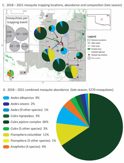 Vector-borne diseases are a major burden for public health in the United States, and the number of cases of mosquito-borne diseases in humans has increased an order of magnitude in the past 15 years [1]. For example, a range expansion of Aedes mosquitoes, specifically Aedes aegypti and Aedes albopictus from Africa and southeast Asia, respectively, to North America has dramatically changed the landscape for arboviral risk in the United States. [2]. These Aedes mosquitoes account for the recently reported intermittent outbreaks and autochthonous transmission of imported Zika, dengue, and chikungunya viruses in the continental United States and associated territories [3]. These events underscore the need to describe patterns of diversity and abundance of mosquito communities in order to understand arboviral risk associated with particular vector species in a region. For example, a West Nile Virus (WNV) outbreak in Oklahoma in 2003 was driven primarily by Culex tarsalis, while subsequent outbreaks in 2007 and 2012 were driven by the Culex quinquefasciatus/pipiens complex. Because these mosquito species have different habitat and host preferences, the spatial distribution of the WNV outbreaks in Oklahoma varied [4].