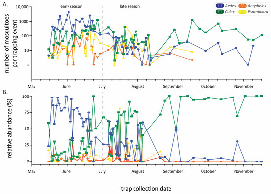 Mosquito abundance by genus throughout the trapping seasons (2018–2021 data combined). Panel (A) is the raw number (logarithmic y-axis) of mosquitoes per trapping event while (B) is the relative abundance from the same dataset. Date range is from 15 May to 16 November, but the length of the sampling season varied among years. The early/late-season dividing line is drawn at 1 July.