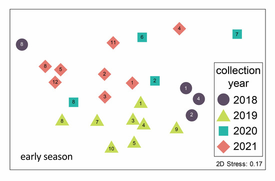 We examined differences in mosquito community composition between seasons and years using multivariate ordination analyses and randomization tests. Samples collected within a given year were divided into early (May–June) and late (July–November) season site-level communities. Mosquito abundance was square-root transformed, and a Bray–Curtis distance matrix was calculated for the taxa–site matrix to measure the similarity of mosquito community composition between sites. First, a nonmetric multidimensional scaling (NMS) ordination was performed to visualize similarities between sites (PRIMER-E Version 6.1.5; PRIMER-E Ltd., Plymouth, UK). In an NMS ordination, the mosquito community at a site is represented by a point, and points that are closer together are more similar in terms of the relative abundance of species present at that site, whereas points that are further apart have less similar mosquito communities. Subsequently, we tested the effect of the year and season on mosquito community composition using the Bray–Curtis distances and associated analysis of similarity (ANOSIM) tests [16]. Site was excluded as a factor because of low replication and large variation in within-site sampling effort. Because early- and late-season mosquito communities differed in terms of community composition, and sampling effort varied considerably between seasons (notably, lack of late season sampling during 2018–2019), we repeated the above analysis using only early season data to test whether mosquito community composition changed across years.
