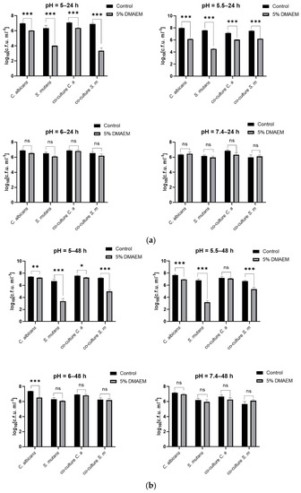 DMAEM@RA inhibited the growth of S. mutans and C. albicans dual-species biofilms in a pH-dependent manner. (a) CFU counts of the single biofilm and dual-species biofilms cultured for 24 h under different pH conditions. (b) CFU counts of the single biofilm and dual-species biofilms cultured for 48 h under different pH conditions. Data are presented as means ± standard deviation (n = 4, * p < 0.05, ** p < 0.01, and *** p < 0.001; ns, no statistical significance).